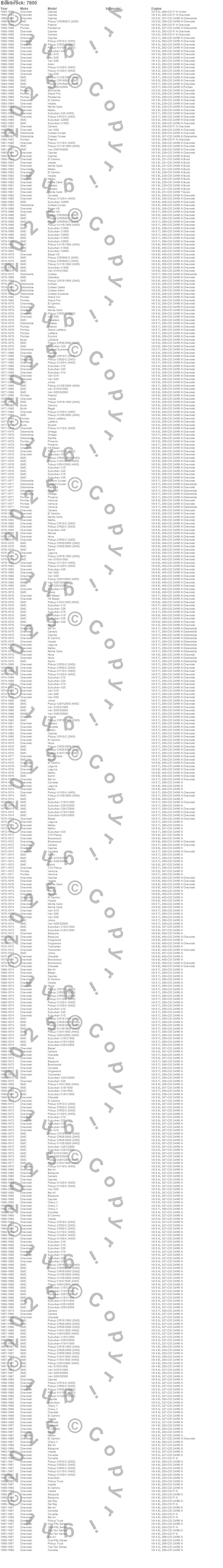 Astro, Bel Air, Biscayne, Blazer, Blazer K5, Bonneville, Brookwood, C10 Pickup, C10 Suburban, C15 Suburban, C15/C1500, C15/C1500 Suburban, C1500, C1500 Suburban, C20 Pickup, C20 Suburban, C25 Suburban, C25/C2500 Pickup, C25/C2500 Suburban, C2500 Pickup more…