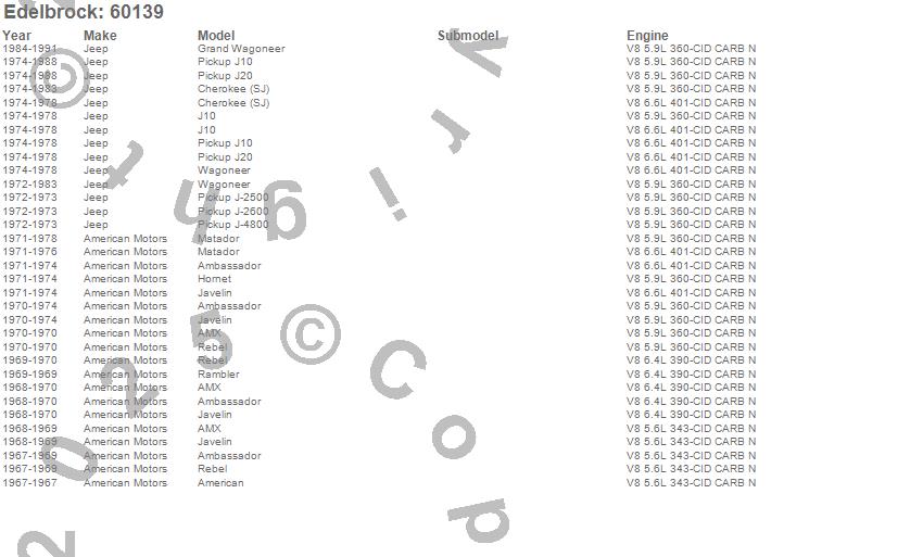 Ambassador, American, AMX, Cherokee (SJ), CJ5, CJ6, CJ7, Concord, DJ5C, Grand Wagoneer, Gremlin, Hornet, J-2500, J-2600, J-4800, J10, J20, Javelin, Jeepster, Matador more…