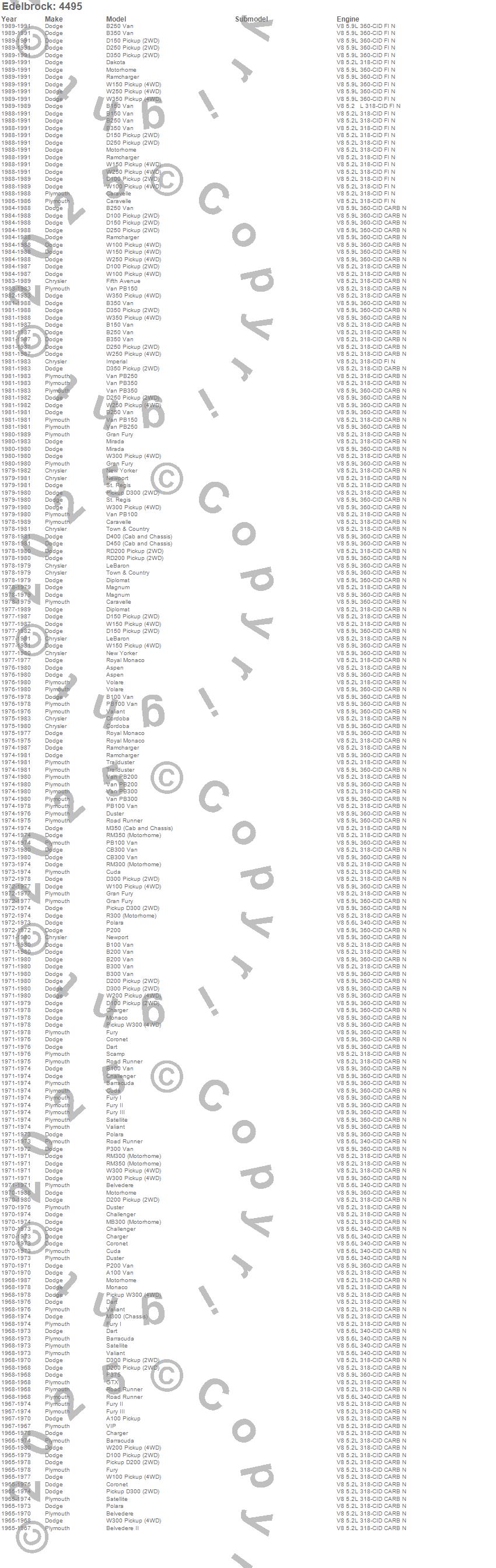 Aspen, B100 Van, B200 Van, B250 Van, B300 Van, B350 Van, Barracuda, CB300 Van, Challenger, Charger, Cordoba, Coronet, Cuda, D100 Pickup, D150 Pickup, D200 Pickup, D250 Pickup, D300 Pickup, D350 Pickup, Dart more...