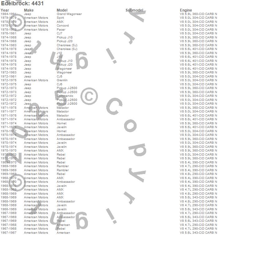 Ambassador, American, AMX, Cherokee (SJ), CJ5, CJ6, CJ7, Concord, DJ5C, Grand Wagoneer, Gremlin, Hornet, J-2500, J-2600, J10, J20, Javelin, Jeepster, Matador, Pacer more…