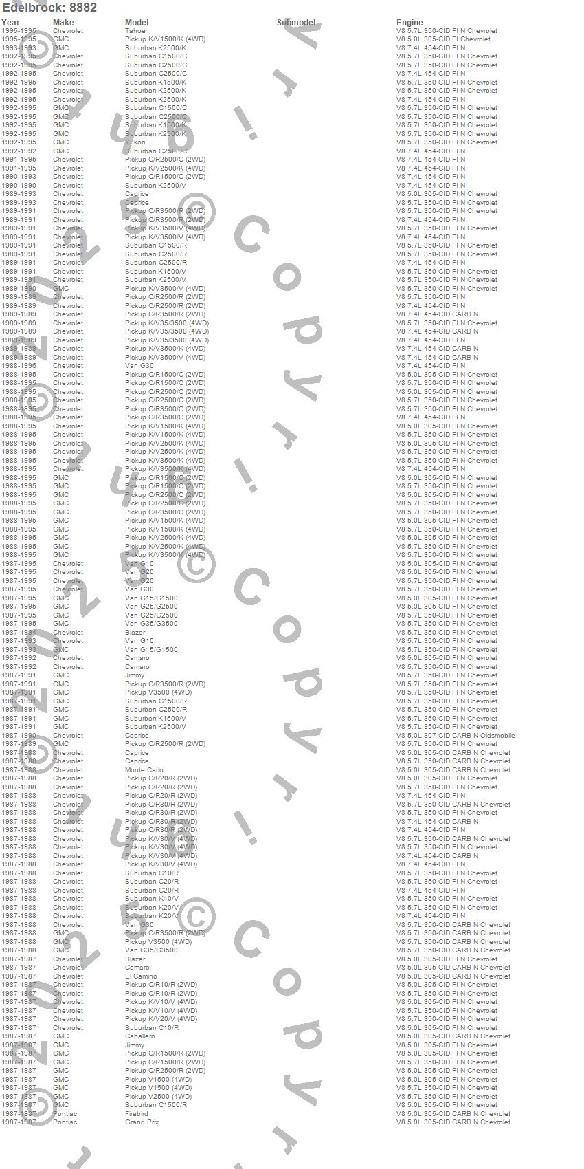 Blazer, C1500, C1500 Pickup, C1500 Suburban, C2500 Pickup, C2500 Suburban, C3500 Pickup, Caballero, Camaro, Caprice, El Camino, Firebird, G10 Van, G15/G1500 Van, G20 Van, G25/G2500 Van, G30 Van, G35/G3500 Van, Grand Prix, Jimmy more...
