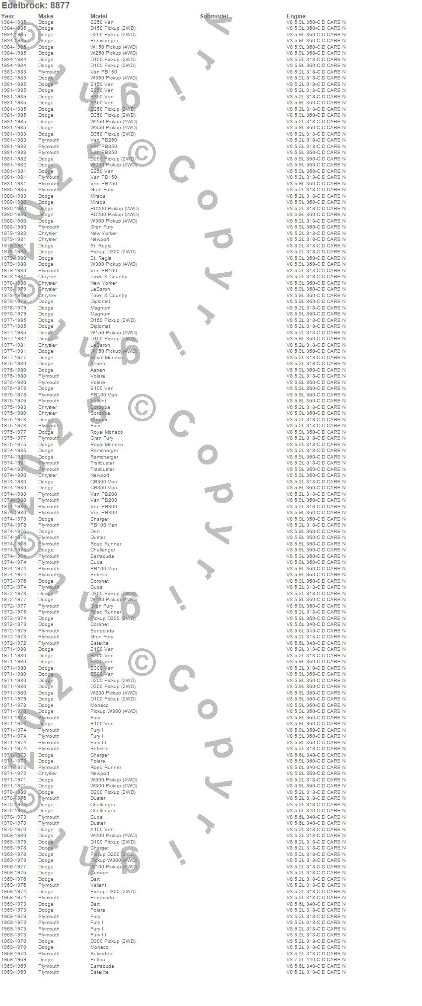 A100 Van, Aspen, B100 Van, B150 Van, B200 Van, B250 Van, B300 Van, B350 Van, Barracuda, Belvedere, CB300 Van, Challenger, Charger, Cordoba, Coronet, Cuda, D100 Pickup, D150 Pickup, D200 Pickup, D250 Pickup more…