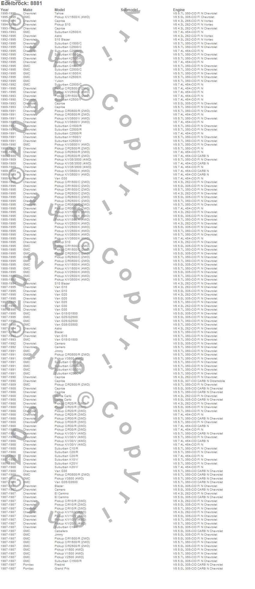 Astro, Blazer, C1500, C1500 Pickup, C1500 Suburban, C2500 Pickup, C2500 Suburban, C3500 Pickup, Caballero, Camaro, Caprice, El Camino, Firebird, G10 Van, G15/G1500 Van, G20 Van, G25/G2500 Van, G30 Van, G35/G3500 Van, Grand Prix more…