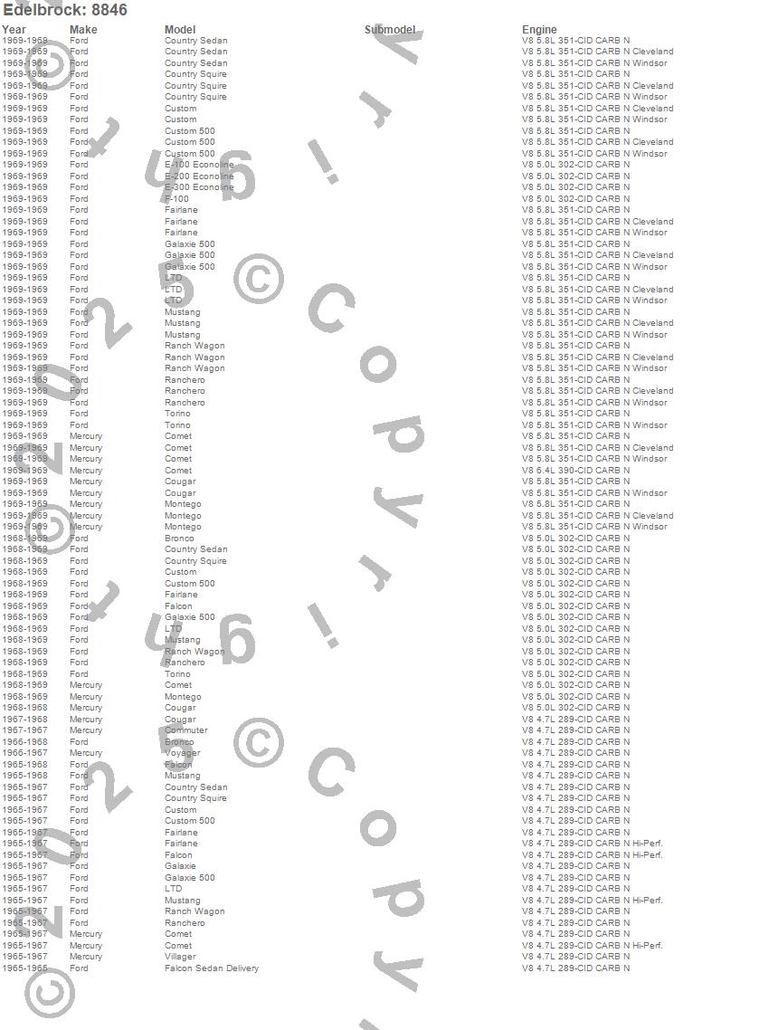 Bronco, Comet, Commuter, Cougar, Country Sedan, Country Squire, Custom, Custom 500, E-100 Econoline, E-200 Econoline, E-300 Econoline, F-100, Fairlane, Falcon, Falcon Sedan Delivery, Galaxie, Galaxie 500, LTD, Montego, Mustang more…