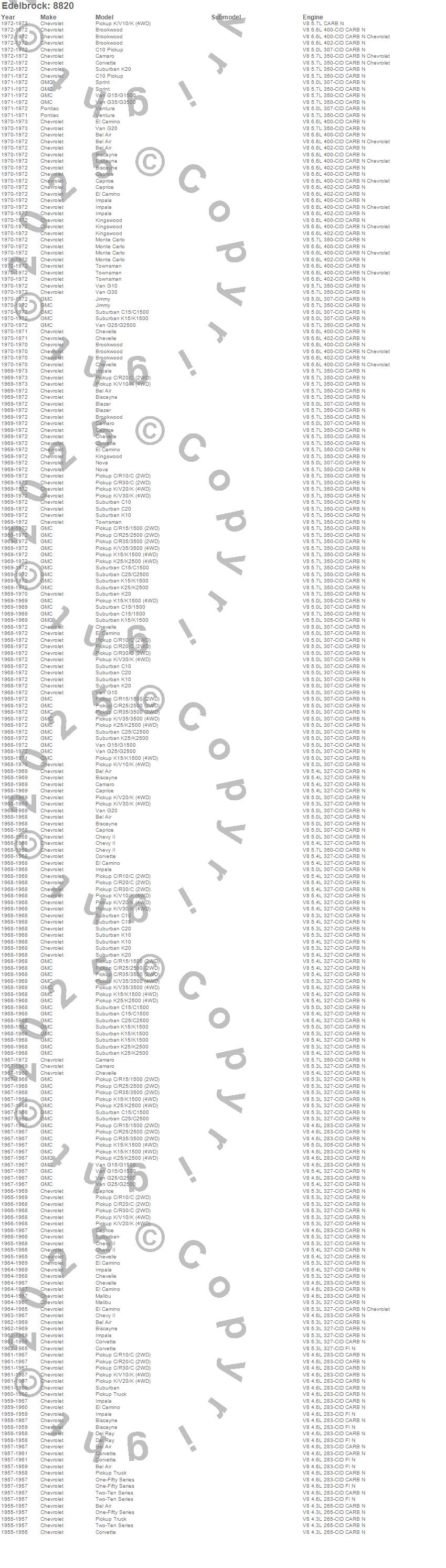 Bel Air, Biscayne, Blazer, Brookwood, C10 Pickup, C10 Suburban, C15/C1500, C15/C1500 Suburban, C20 Pickup, C20 Suburban, C25/C2500 Pickup, C25/C2500 Suburban, C30 Pickup, C35/C3500 Pickup, Camaro, Caprice, Chevelle, Chevy II, Corvette, Del Ray more…