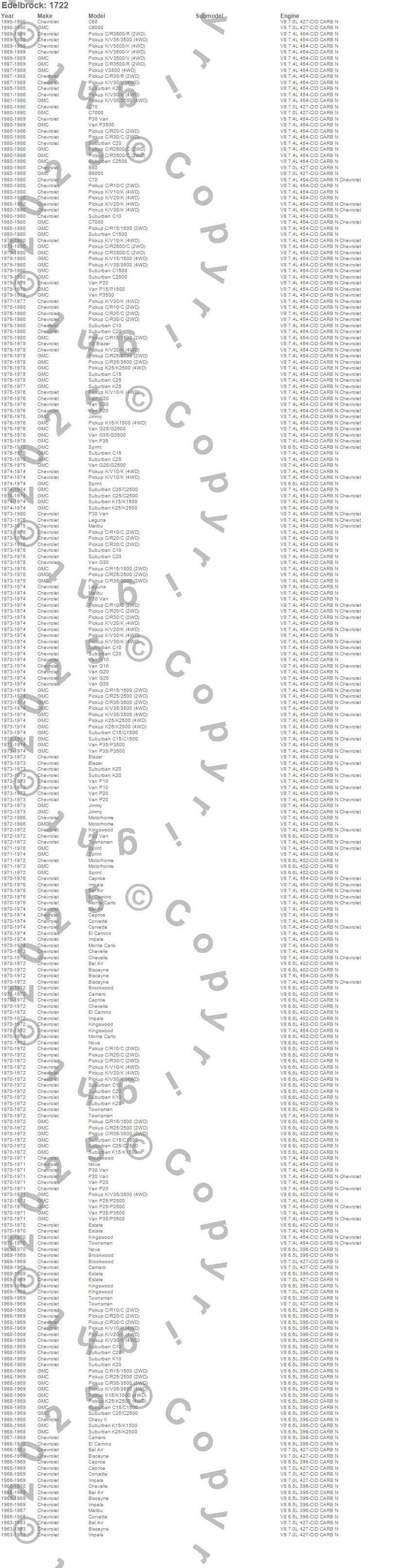 B60, B6000, Bel Air, Biscayne, Blazer, Blazer K5, Brookwood, C10 Pickup, C10 Suburban, C15 Suburban, C15/C1500, C15/C1500 Suburban, C1500, C1500 Suburban, C20 Pickup, C20 Suburban, C25 Suburban, C25/C2500 Pickup, C25/C2500 Suburban, C2500 Pickup more…