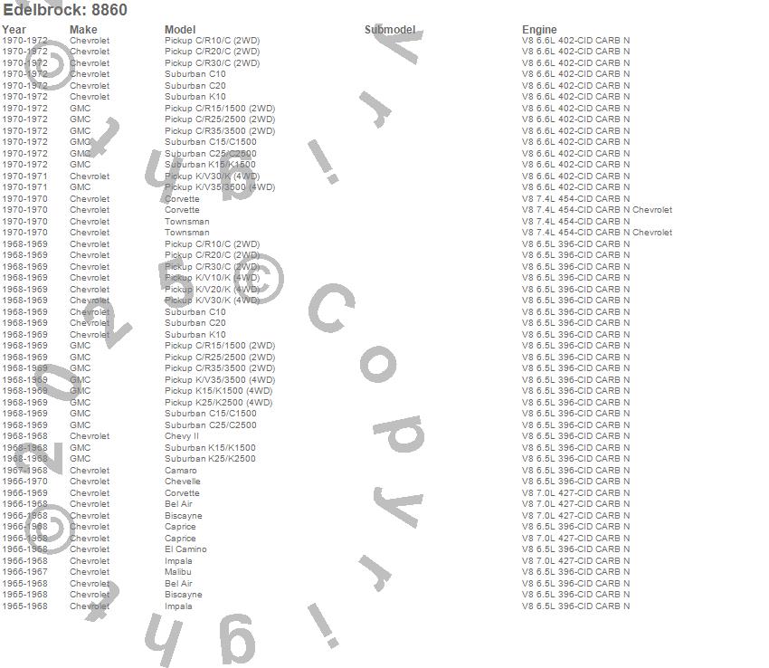 Bel Air, Biscayne, C10 Pickup, C10 Suburban, C15/C1500, C15/C1500 Suburban, C20 Pickup, C20 Suburban, C25/C2500 Pickup, C25/C2500 Suburban, C30 Pickup, C35/C3500 Pickup, Camaro, Caprice, Chevelle, Chevy II, Corvette, El Camino, Impala, K10 Pickup more…