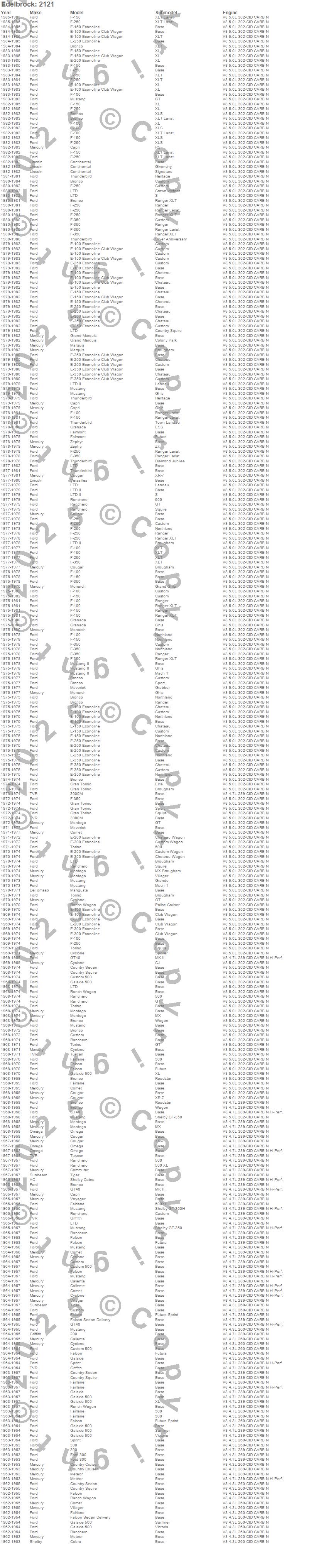 Bronco, Capri, Club Cargo, Comet, Commuter, Continental, Cougar, Country Sedan, Country Squire, Custom, Custom 500, E-100 Econoline, E-150 Econoline, E-200 Econoline, E-250 Econoline, E-300 Econoline, E-350 Econoline, F-100, F-150, F-250 more…