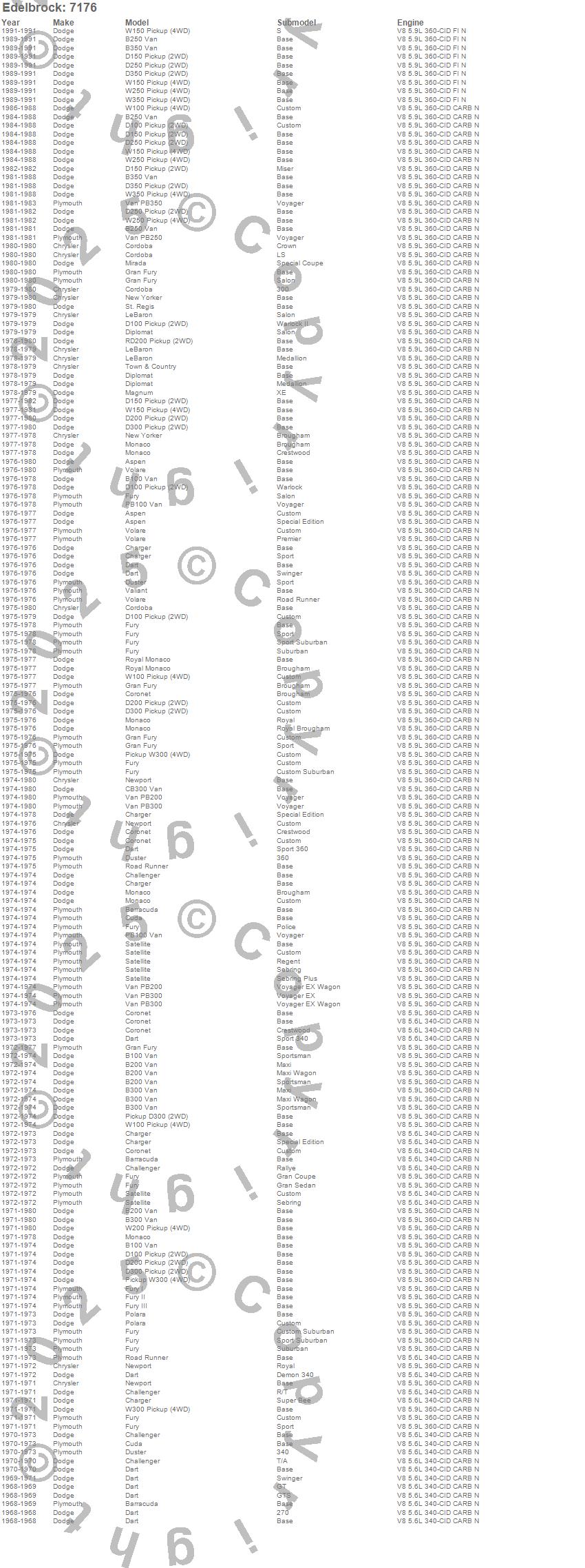 Aspen, B100 Van, B200 Van, B250 Van, B300 Van, B350 Van, Barracuda, CB300 Van, Challenger, Charger, Cordoba, Coronet, Cuda, D100 Pickup, D150 Pickup, D200 Pickup, D250 Pickup, D300 Pickup, D350 Pickup, Dart more…