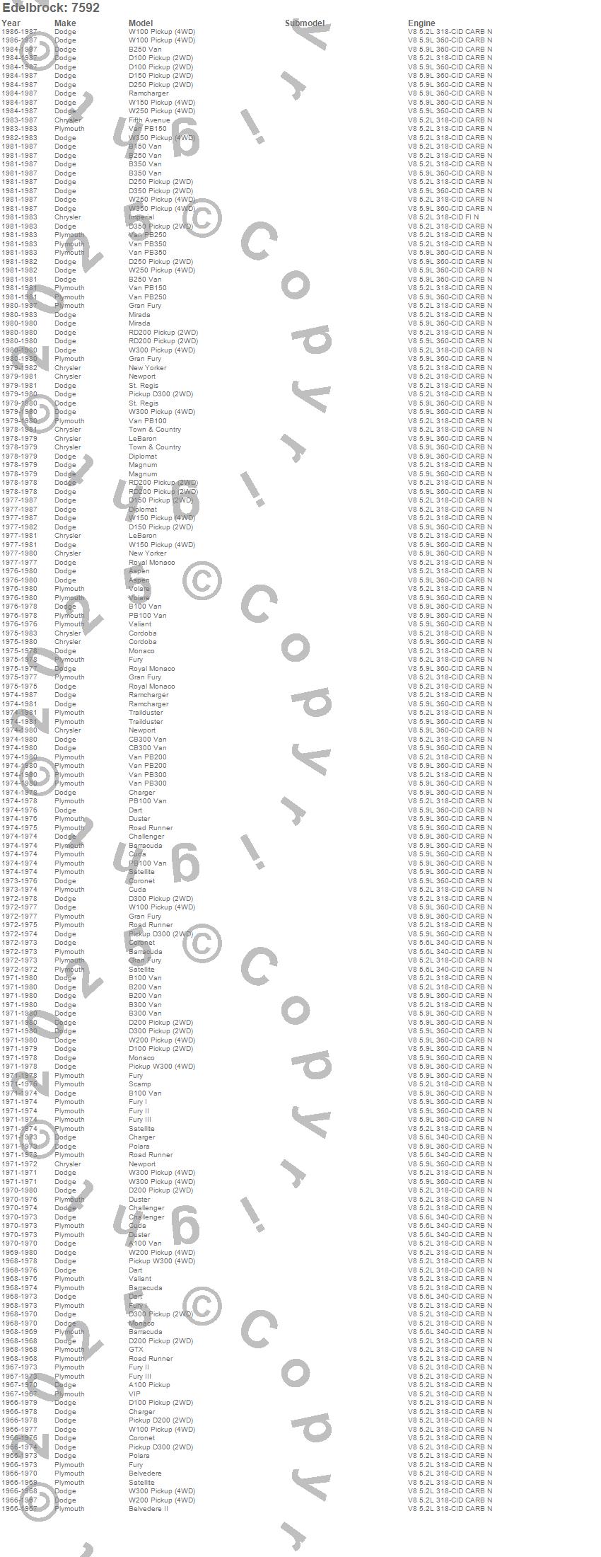A100 Truck, A100 Van, Aspen, B100 Van, B150 Van, B200 Van, B250 Van, B300 Van, B350 Van, Barracuda, Belvedere, Belvedere II, CB300 Van, Challenger, Charger, Cordoba, Coronet, Cuda, D100 Pickup, D150 Pickup more…