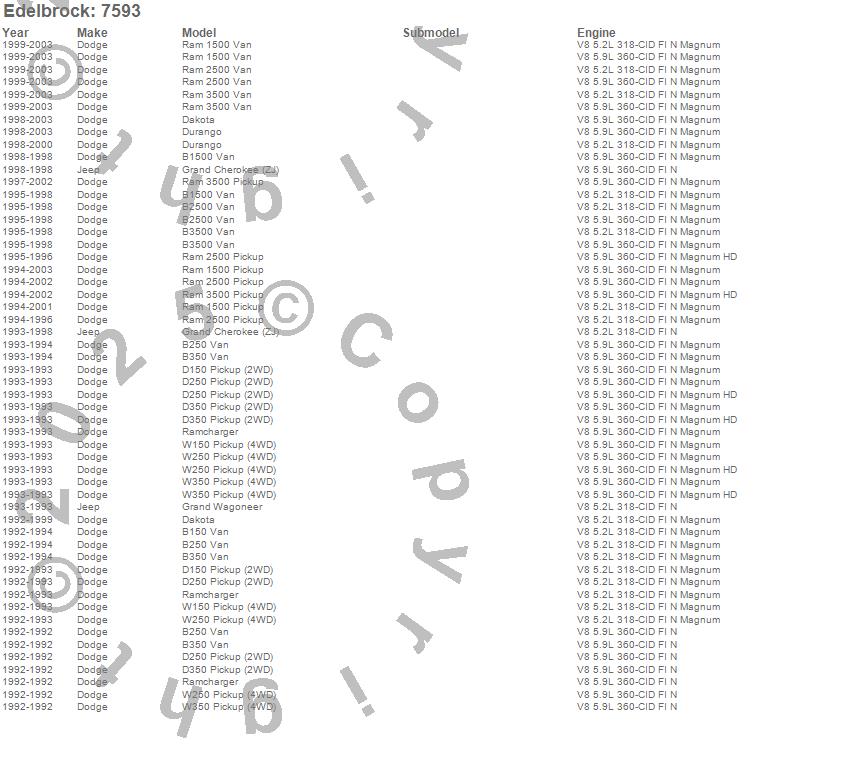 B150 Van, B1500 Van, B250 Van, B2500 Van, B350 Van, B3500 Van, D150 Pickup, D250 Pickup, D350 Pickup, Dakota, Durango, Grand Cherokee (ZJ), Grand Wagoneer, Ram 1500, Ram 1500 Van, Ram 2500, Ram 2500 Van, Ram 3500, Ram 3500 Van, Ramcharger more...