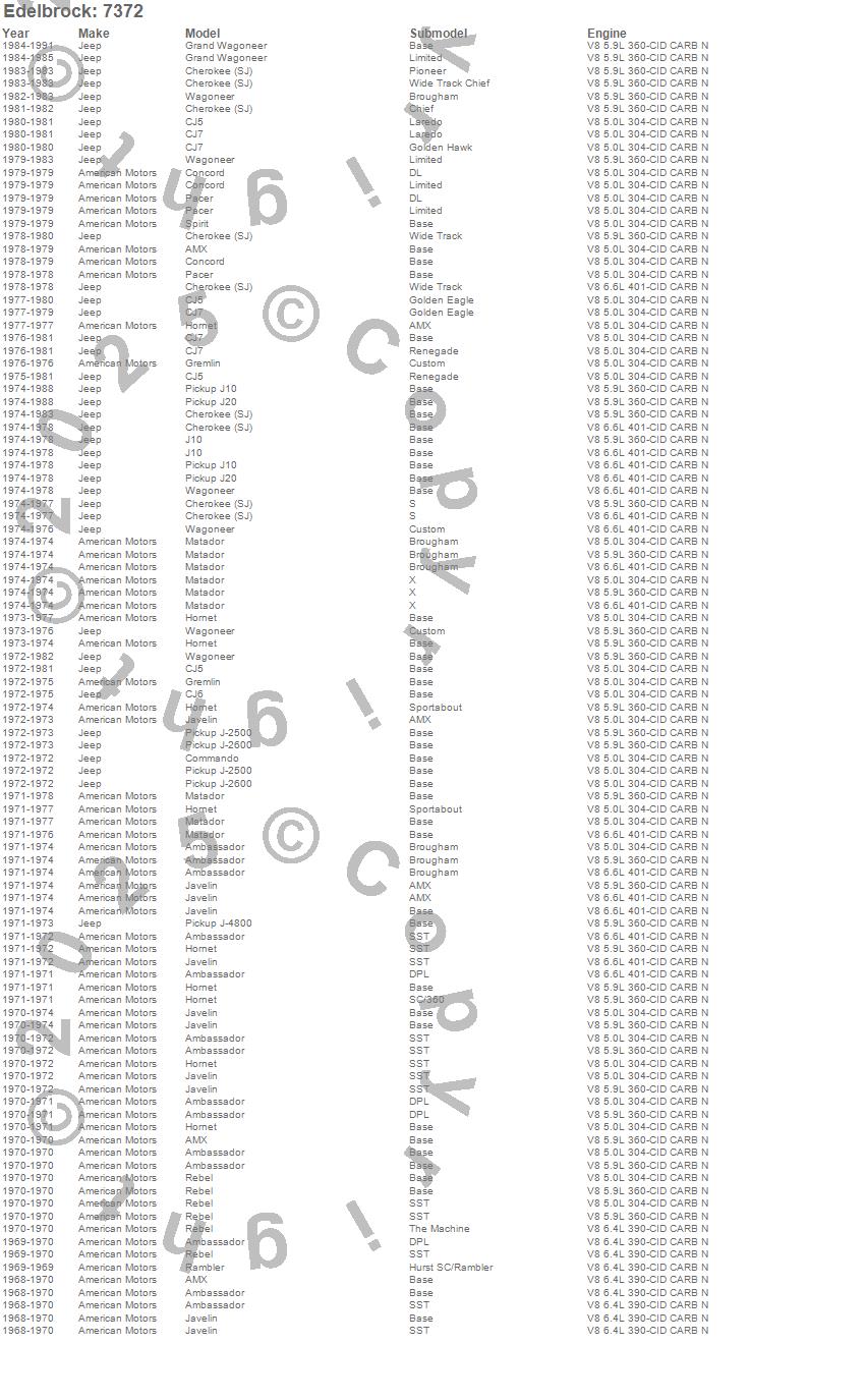 Ambassador, AMX, Cherokee (SJ), CJ5, CJ6, CJ7, Concord, DJ5C, Grand Wagoneer, Gremlin, Hornet, J-2500, J-2600, J-4800, J10, J20, Javelin, Jeepster, Matador, Pacer more…