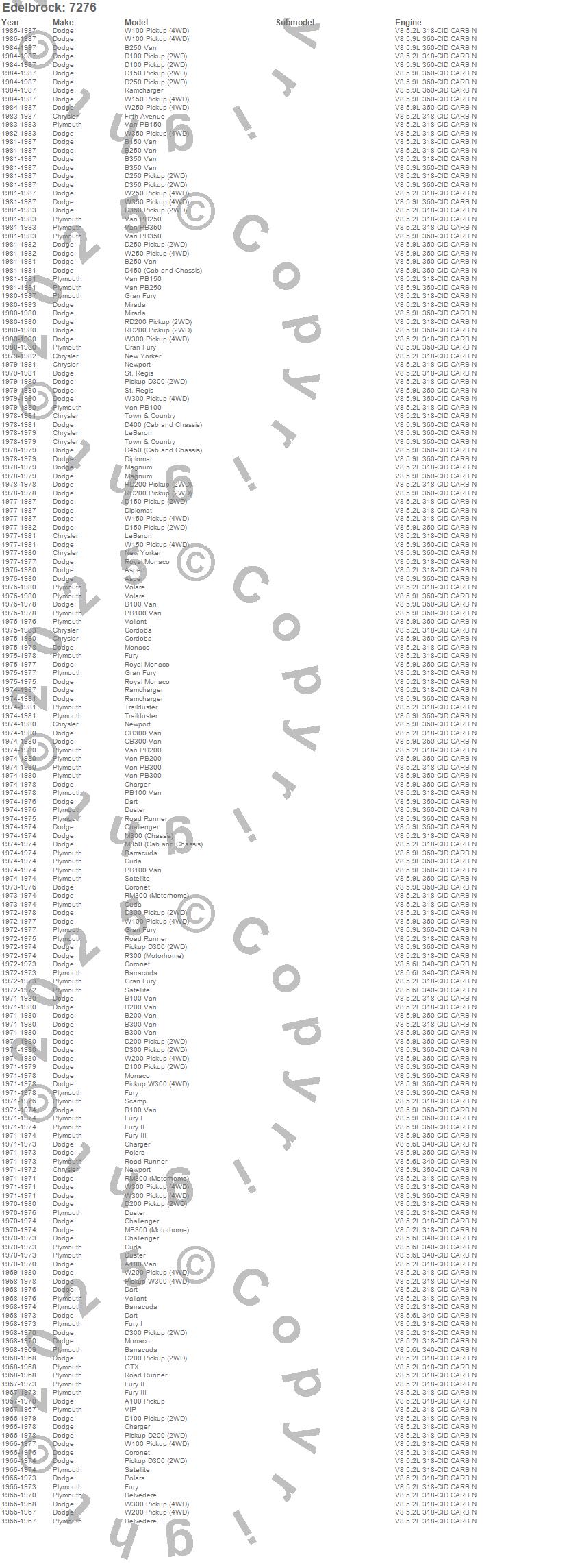 A100 Truck, A100 Van, Aspen, B100 Van, B150 Van, B200 Van, B250 Van, B300 Van, B350 Van, Barracuda, Belvedere, Belvedere II, CB300 Van, Challenger, Charger, Cordoba, Coronet, Cuda, D100 Pickup, D150 Pickup more…