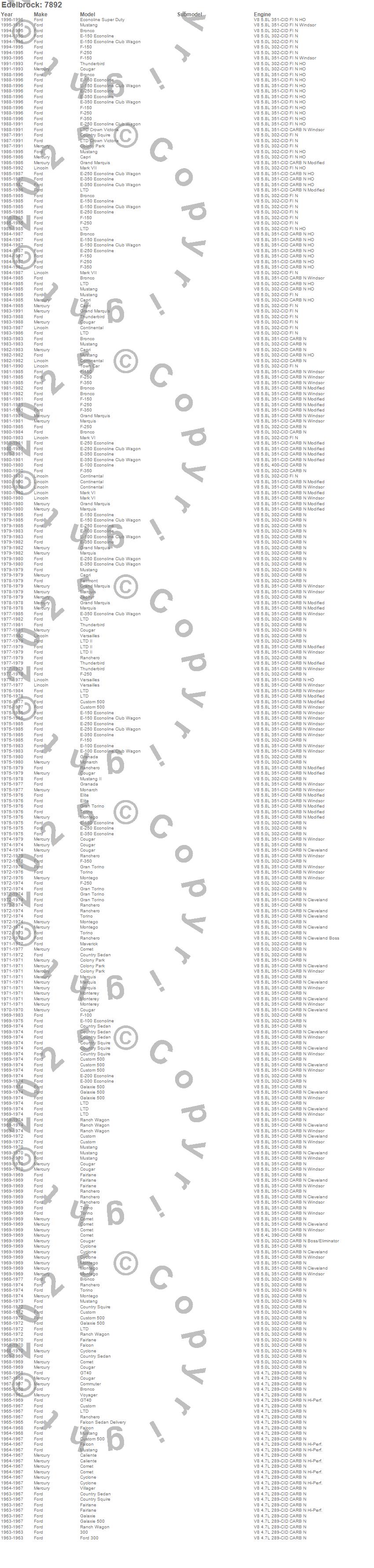 Bronco, Caliente, Capri, Club Cargo, Colony Park, Comet, Commuter, Continental, Cougar, Country Sedan, Country Squire, Custom, Custom 500, Cyclone, E Super Duty, E-100 Econoline, E-100 Econoline Club Wagon, E-150 Econoline, E-150 Econoline Club Wagon, E-200 Econoline more...