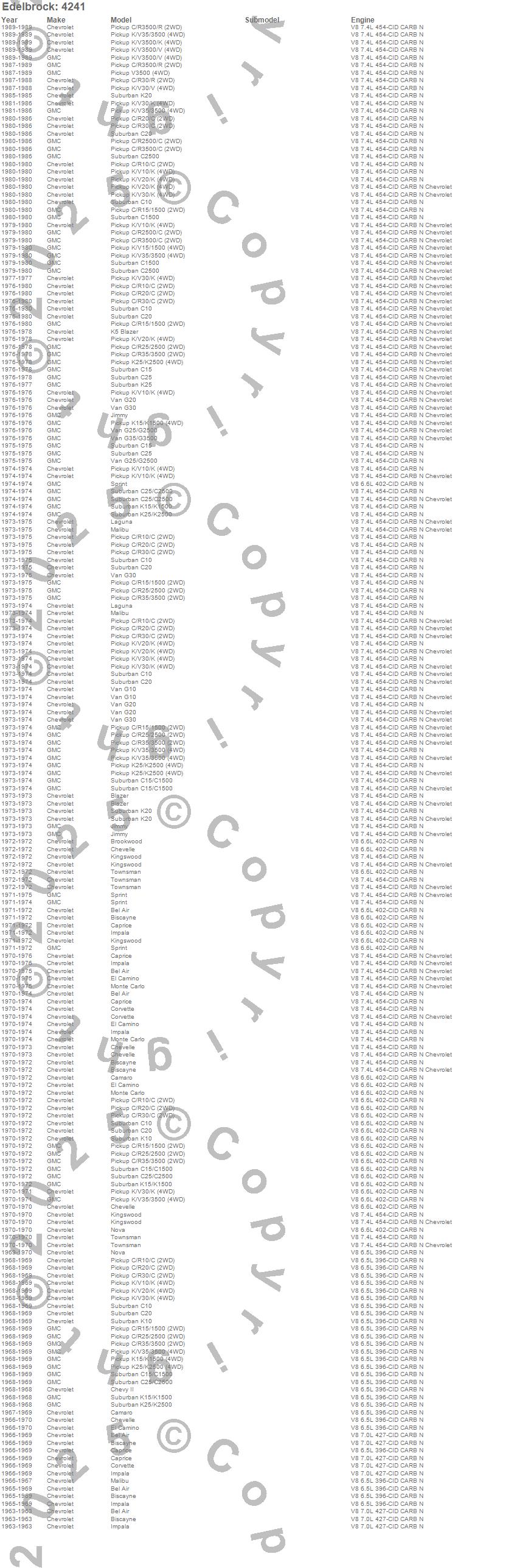 Bel Air, Biscayne, Blazer, Blazer K5, Brookwood, C10 Pickup, C10 Suburban, C15 Suburban, C15/C1500, C15/C1500 Suburban, C1500, C1500 Suburban, C20 Pickup, C20 Suburban, C25 Suburban, C25/C2500 Pickup, C25/C2500 Suburban, C2500 Pickup, C2500 Suburban, C30 Pickup more...
