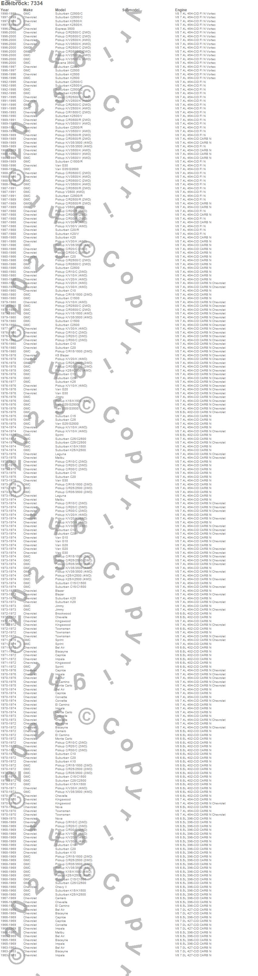 Bel Air, Biscayne, Blazer, Blazer K5, Brookwood, C10 Pickup, C10 Suburban, C15 Suburban, C15/C1500, C15/C1500 Suburban, C1500, C1500 Pickup, C1500 Suburban, C20 Pickup, C20 Suburban, C25 Suburban, C25/C2500 Pickup, C25/C2500 Suburban, C2500 Pickup, C2500 Suburban more...