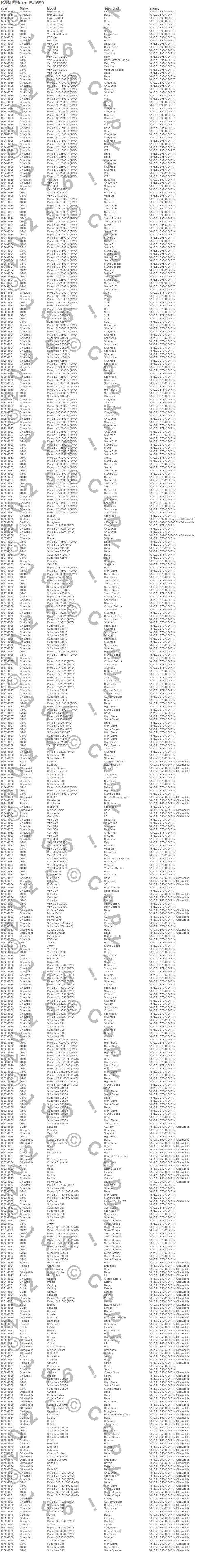 Below is an abreviated list of applications for the Air Filter.