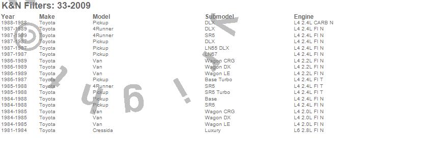 Below is an abreviated list of applications for the Air Filter.