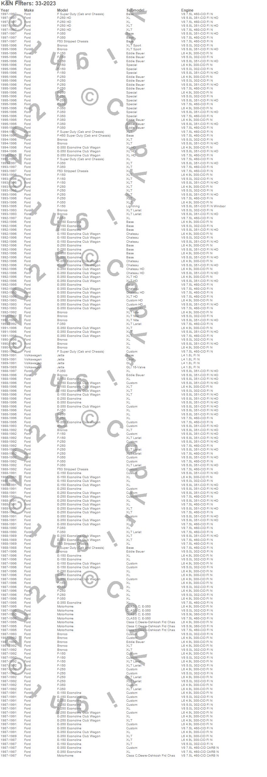 Below is an abreviated list of applications for the Air Filter.