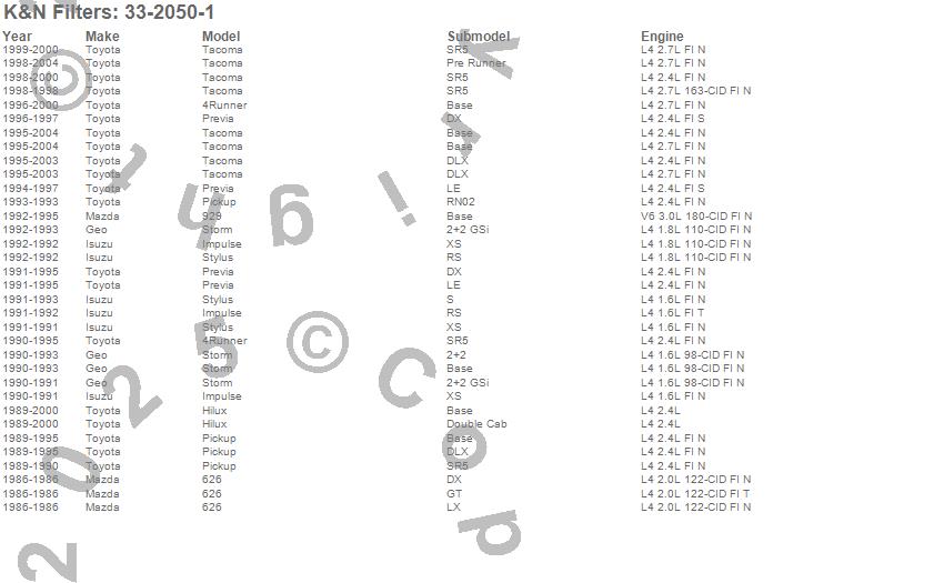 Below is an abreviated list of applications for the Air Filter.