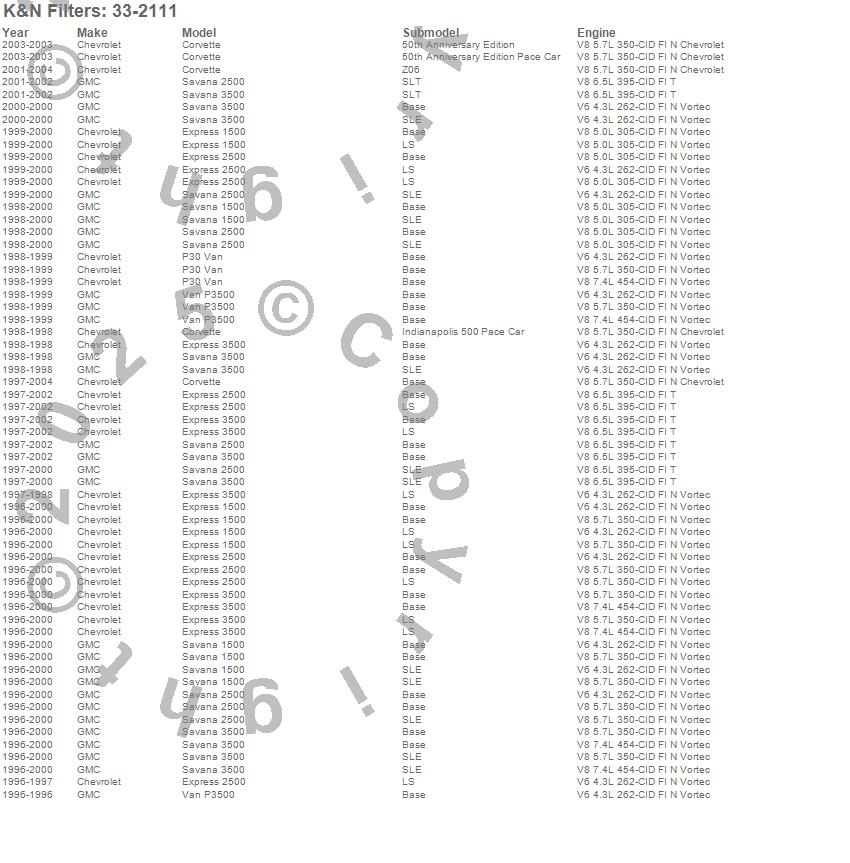 Below is an abreviated list of applications for the Air Filter.