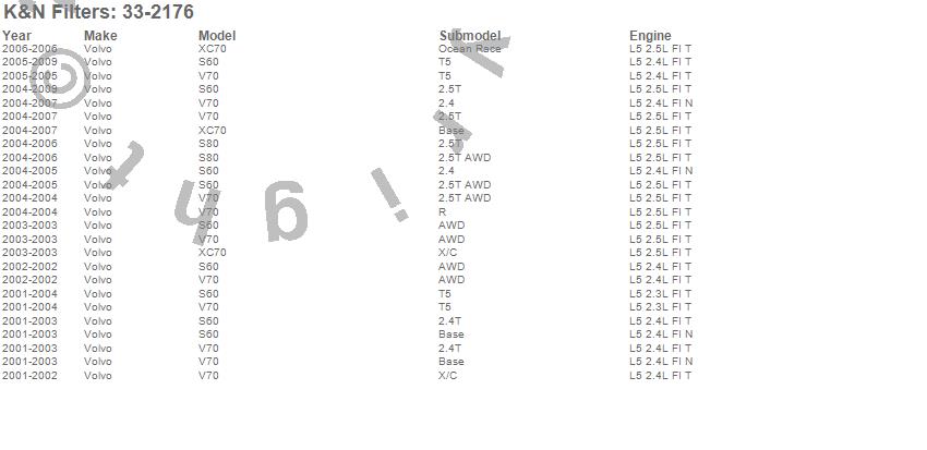 Below is an abreviated list of applications for the Air Filter.
