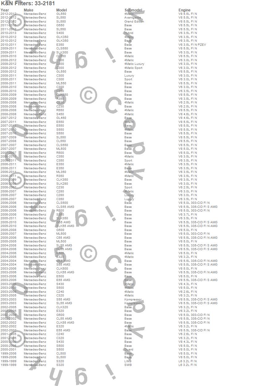 Below is an abreviated list of applications for the Air Filter.