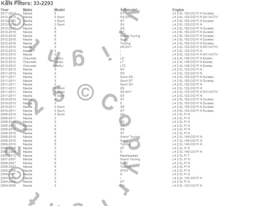 Below is an abreviated list of applications for the Air Filter.