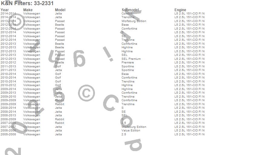 Below is an abreviated list of applications for the Air Filter.