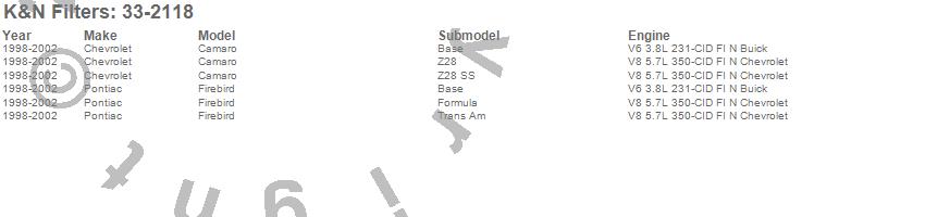 Below is an abreviated list of applications for the Air Filter.