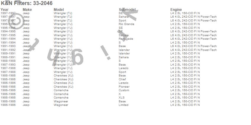 Below is an abreviated list of applications for the Air Filter.