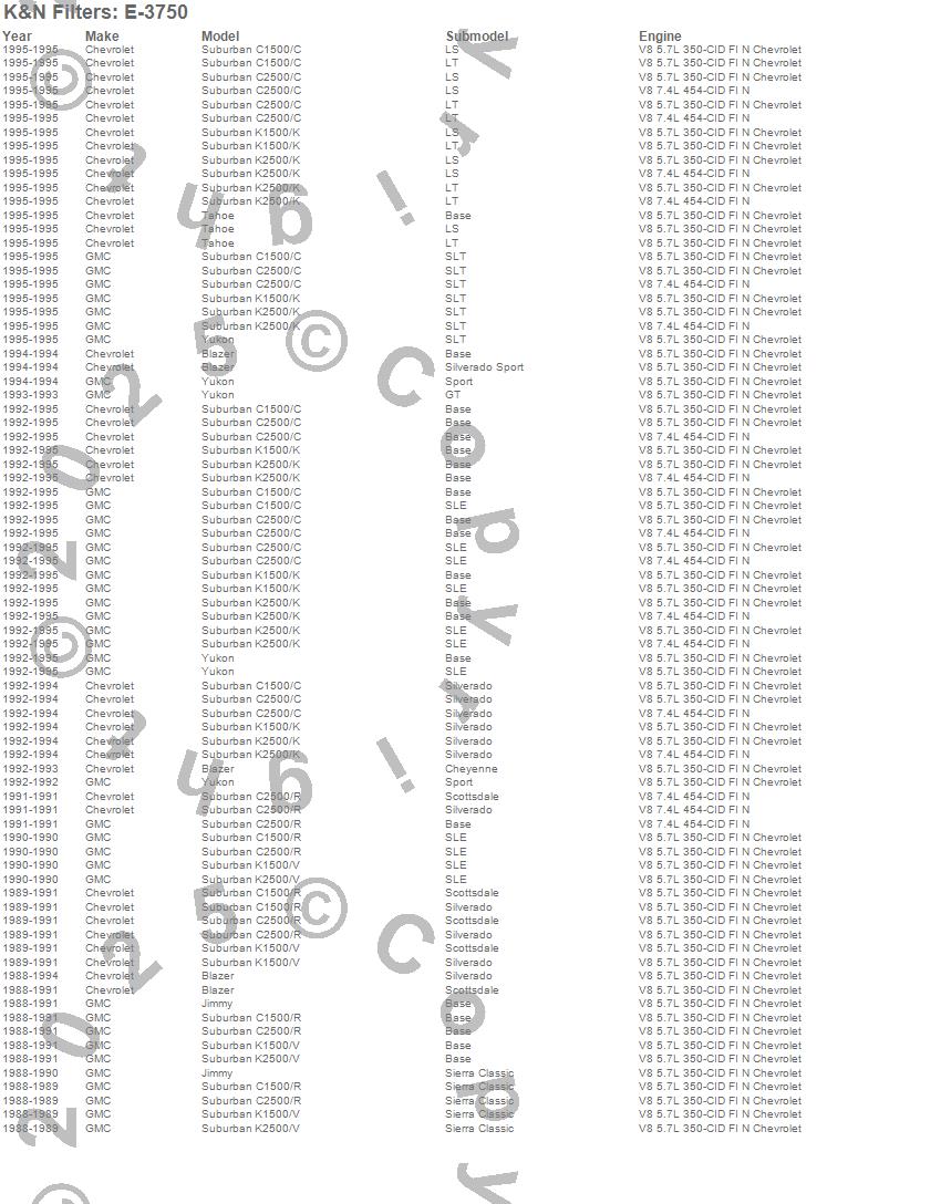 Below is an abreviated list of applications for the Air Filter.