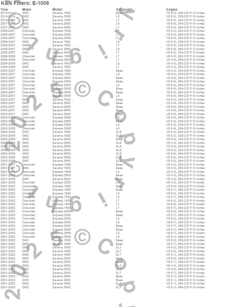 Below is an abreviated list of applications for the Air Filter.