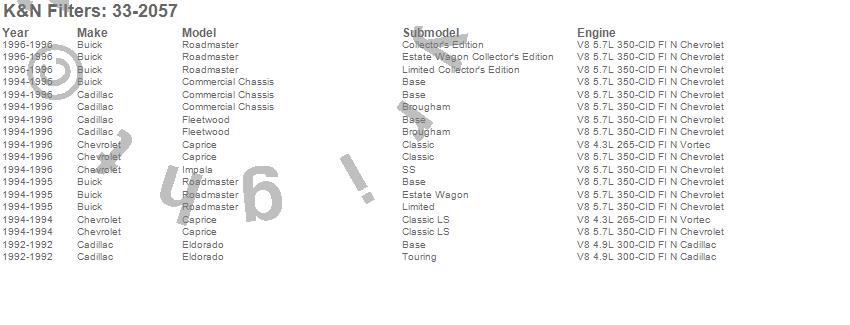 Below is an abreviated list of applications for the Air Filter.