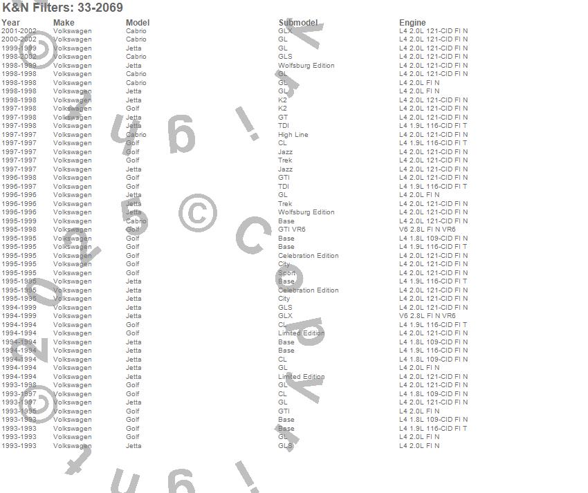 Below is an abreviated list of applications for the Air Filter.