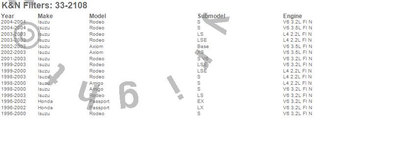 Below is an abreviated list of applications for the Air Filter.