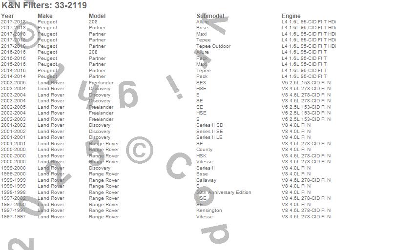 Below is an abreviated list of applications for the Air Filter.