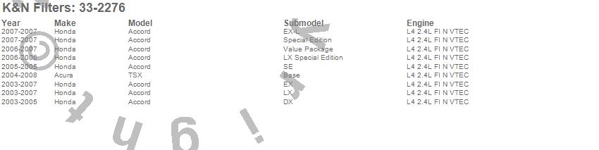 Below is an abreviated list of applications for the Air Filter.