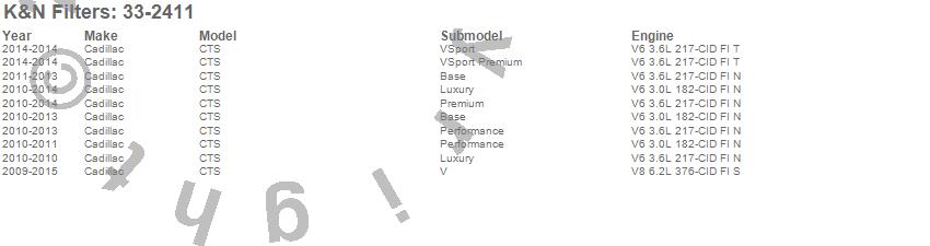 Below is an abreviated list of applications for the Air Filter.