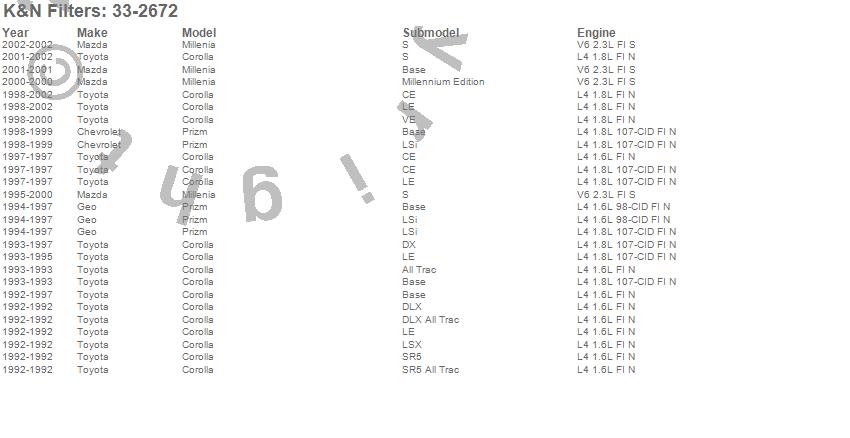Corolla, Millenia, Prizm, Chevrolet, Geo, Mazda, Toyota, 2002, 2001, 2000, 1999, 1998, 1997, 1996, 1995, 1994, 1993, 1992 more…
