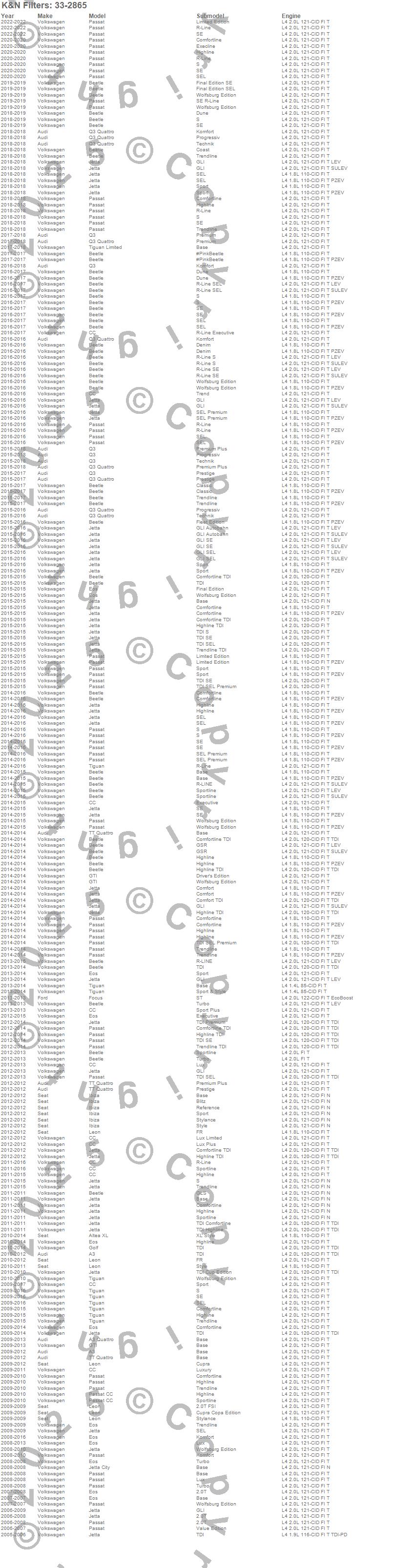 Below is an abreviated list of applications for the Air Filter.