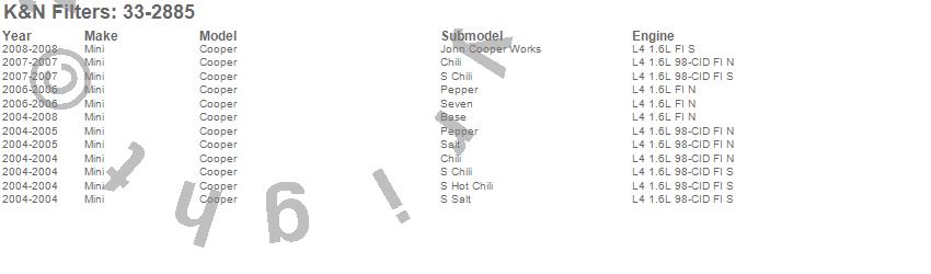Below is an abreviated list of applications for the Air Filter.
