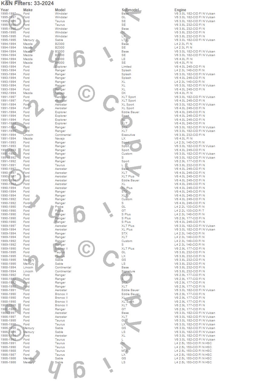 Below is an abreviated list of applications for the Air Filter.
