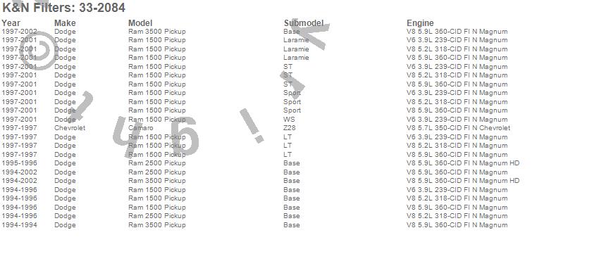 Below is an abreviated list of applications for the Air Filter.
