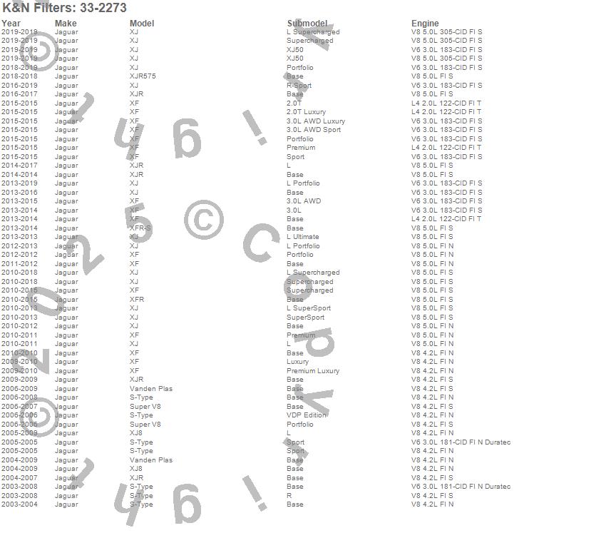 Below is an abreviated list of applications for the Air Filter.