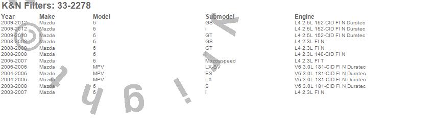 Below is an abreviated list of applications for the Air Filter.