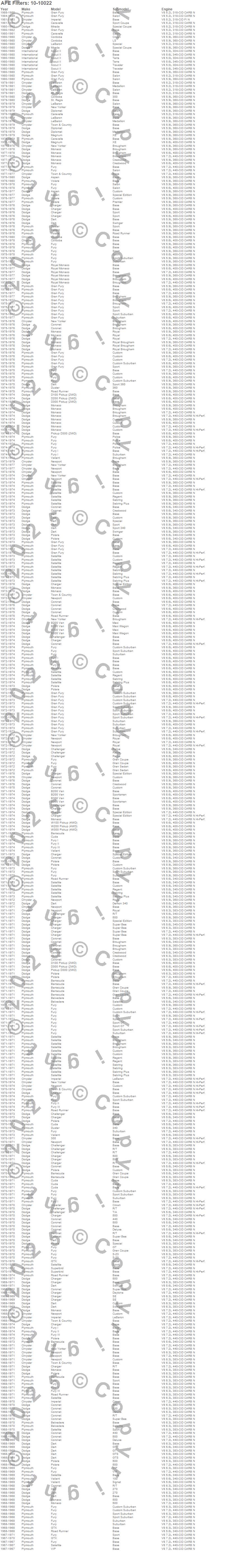 300, Aspen, B200 Van, B250 Van, B300 Van, B350 Van, Barracuda, Belvedere, Challenger, Charger, Cordoba, Coronet, Cuda, D100 Pickup, D200 Pickup, D300 Pickup, Dart, Diplomat, Duster, Fury more…