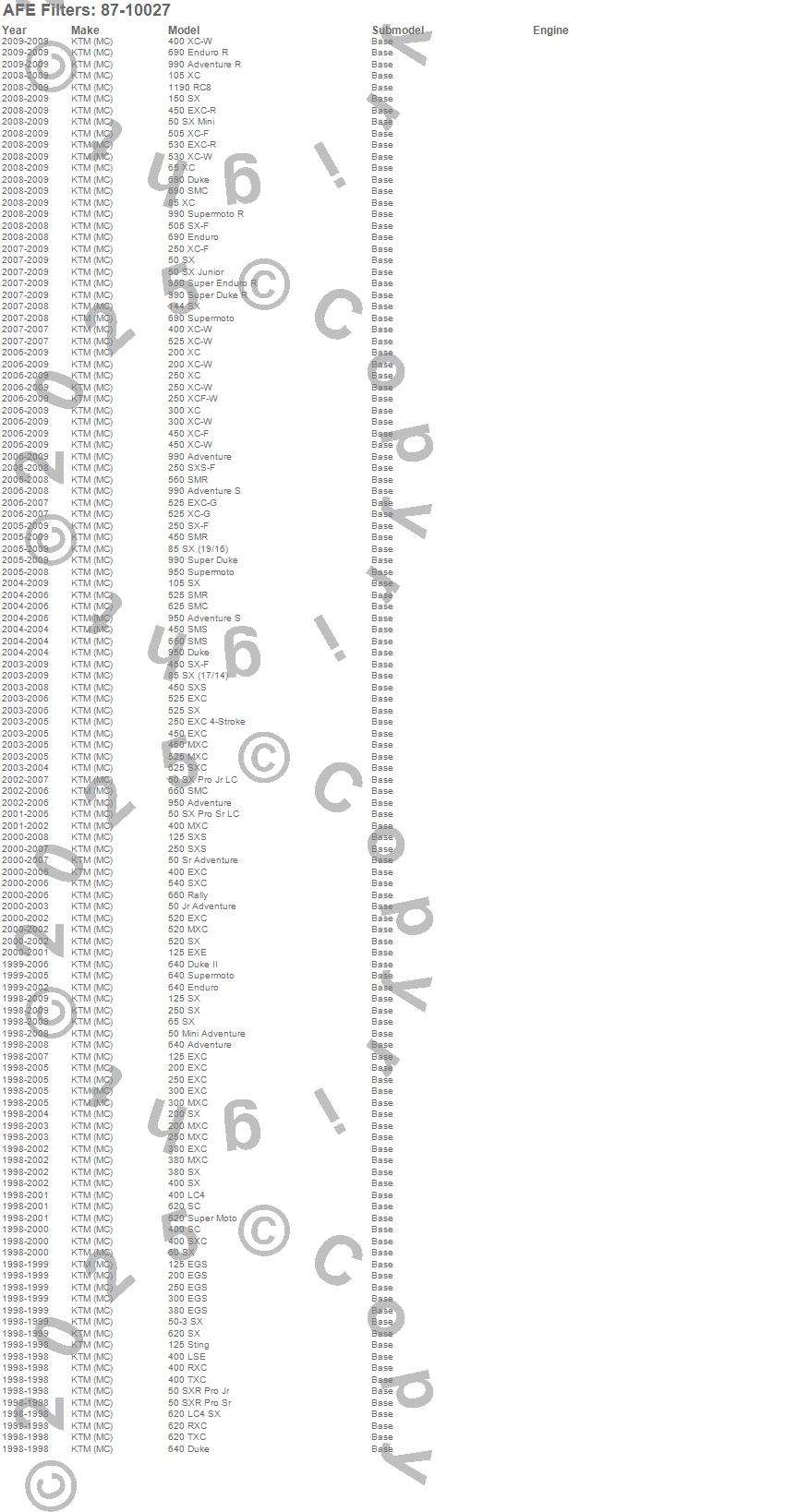 105 SX, 105 XC, 1190 RC8, 125 EGS, 125 EXC, 125 EXE, 125 Sting, 125 SX, 125 SXS, 144 SX, 150 SX, 200 EGS, 200 EXC, 200 MXC, 200 SX, 200 XC, 200 XC-W, 250 EGS, 250 EXC, 250 EXC 4-Stroke more…