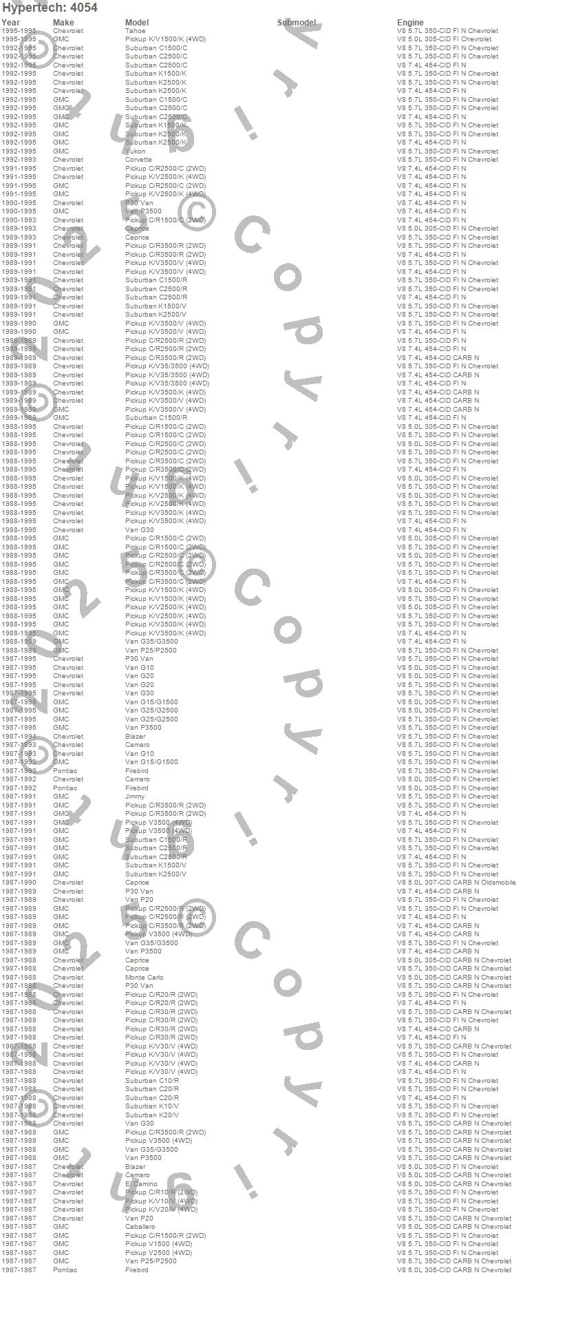Blazer, C1500, C1500 Pickup, C1500 Suburban, C2500 Pickup, C2500 Suburban, C3500 Pickup, Caballero, Camaro, Caprice, El Camino, Firebird, G10 Van, G15/G1500 Van, G20 Van, G25/G2500 Van, G30 Van, G35/G3500 Van, Jimmy, K1500 more…