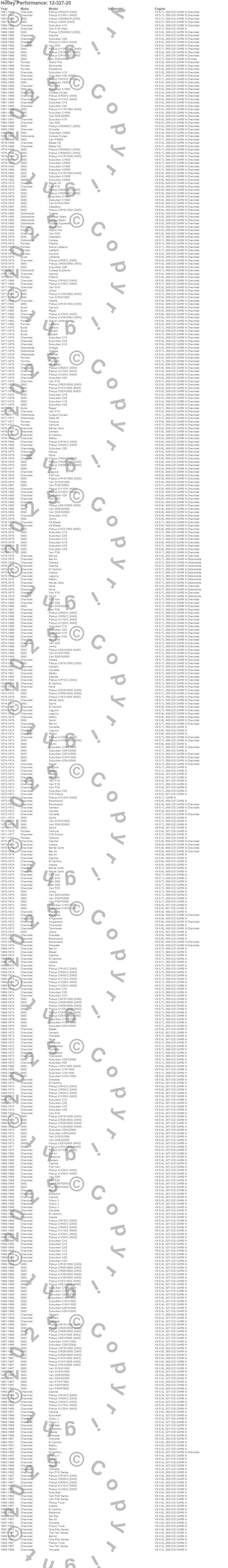 Bel Air, Biscayne, Blazer, Blazer K5, Bonneville, Brookwood, C10 Pickup, C10 Suburban, C15 Suburban, C15/C1500, C15/C1500 Suburban, C1500, C1500 Suburban, C20 Pickup, C20 Suburban, C25 Suburban, C25/C2500 Pickup, C25/C2500 Suburban, C2500 Pickup, C2500 Suburban more…